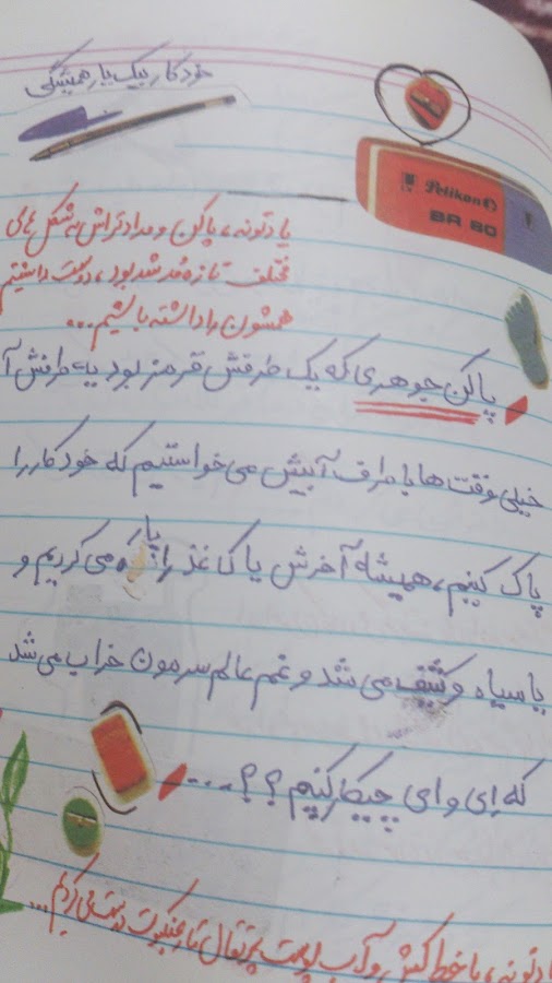 یادمه شکل کلّه یه گاو داخلش بود. منم یه کاغذی رو نفتی کردم و از روش کشیدم. کلاس اول دبستان بودم. معلممون وقتی دید باور نکرد که کار خودمه. بهم گفت یه بار دیگه نقاشی رو بکشم. اما من این دفعه بدون ارژنگ تونستم بکشمش. هیچی دیگه معلمه (آقای جلالی) کف کرده بود. گفت به مامانت بگو بیاد مدرسه کارش دارم.